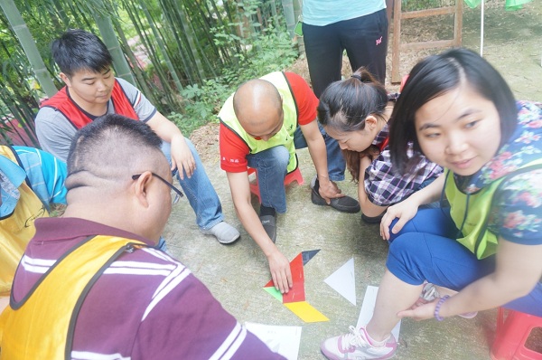 集合、報數、整隊、分組,一行人被分為6組開始不同主題的拓展活動,學員們分別進行了“國王與天使”、“目標市場”、“七巧板”、“團隊動力圈”、“挑戰(zhàn)99”、“合力致勝”和“畢業(yè)墻”等拓展科目。