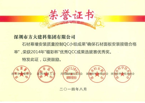 9月26日,方大建科公司獲得由深圳市質(zhì)量協(xié)會(huì)、深圳市總工會(huì)、共青團(tuán)深圳市委員會(huì)、深圳市婦女聯(lián)合會(huì)和深圳市科技技術(shù)協(xié)會(huì)聯(lián)合頒發(fā)的“2014年深圳市質(zhì)量管理小組活動(dòng)優(yōu)秀企業(yè)”稱號(hào)。同日,由深圳市質(zhì)量協(xié)會(huì)、深圳市總工會(huì)、共青團(tuán)深圳市委員會(huì)、深圳市婦女聯(lián)合會(huì)和深圳市科技技術(shù)協(xié)會(huì)聯(lián)合評(píng)定的“福彩杯”優(yōu)秀QCC成果優(yōu)秀獎(jiǎng)揭曉。方大建科公司打膠質(zhì)量控制QC小組成果“提高單元板塊封邊合格率”榮獲2014年“福彩杯”QCC成果選拔賽銀獎(jiǎng),方大建科公司單元板塊安裝質(zhì)量控制QC小組成果“提高單元板塊安裝水平度合格率”,方大建科公司石材幕墻安裝質(zhì)量控制QC小組成果“確保石材面板安裝接縫合格率”、 方大自動(dòng)化公司門機(jī)梁皮帶夾改造QC小組成果“提高門機(jī)梁傳動(dòng)系統(tǒng)組裝合格率及使用壽命率”榮獲“深圳市2014年‘福彩杯’QCC成果選拔賽優(yōu)秀獎(jiǎng)”, 集團(tuán)公司企業(yè)管理部尚清榮獲“深圳市質(zhì)量管理小組活動(dòng)卓越領(lǐng)導(dǎo)者”稱號(hào),方大建科公司張錦德榮獲“深圳市質(zhì)量管理小組活動(dòng)優(yōu)秀推進(jìn)者” 稱號(hào)。