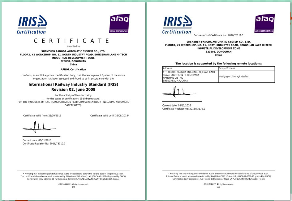 深圳市方大自動化系統(tǒng)有限公司作為全球最大的軌道交通屏蔽門系統(tǒng)供應(yīng)商,導(dǎo)入IRIS經(jīng)營管理體系是公司與世界先進管理方法接軌的必要舉措。IRIS管理體系認證證書的獲得,是獨立的第三方機構(gòu)對方大自動化公司的管理體系符合國際鐵路行業(yè)統(tǒng)一規(guī)范標準的認可。通過IRIS經(jīng)營管理體系認證,意味著方大自動化公司的管理體系接軌世界先進管理方法,在ISO9000基礎(chǔ)上進一步提升企業(yè)的整體管理水平。在取得IRIS管理體系認證證書后,方大自動化公司的相關(guān)認證信息將由IRIS管理中心錄入IRIS門戶網(wǎng)站認證信息庫進行統(tǒng)一管理,同時可供全球鐵路行業(yè)客戶進行檢索、瀏覽,這為方大自動化公司拓展市場領(lǐng)域、獲取更多的國際訂單提供了強有力的保障。