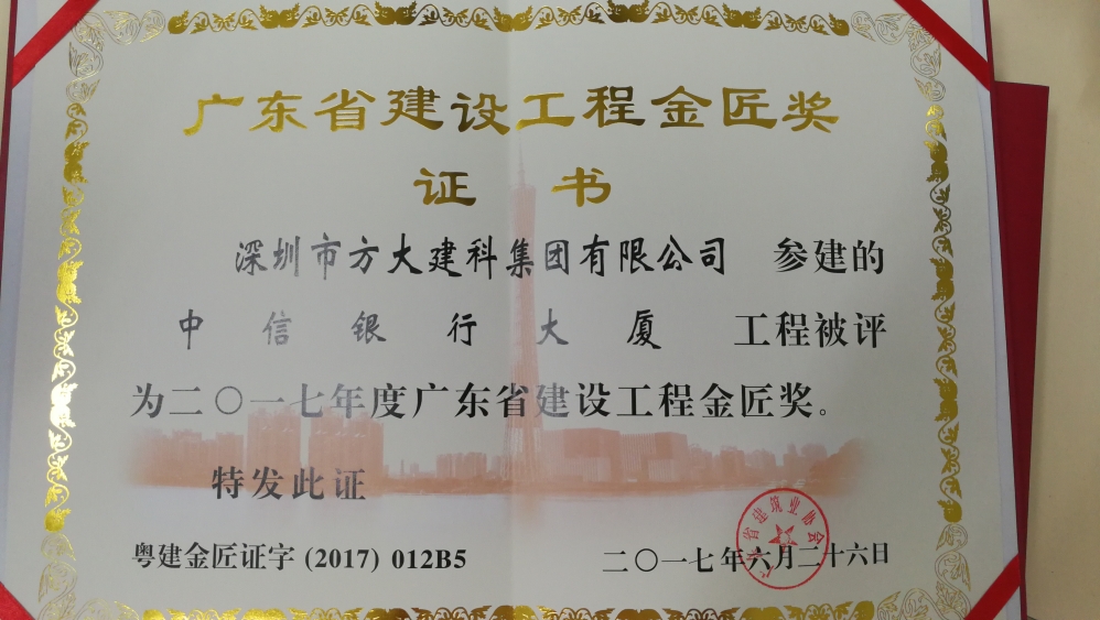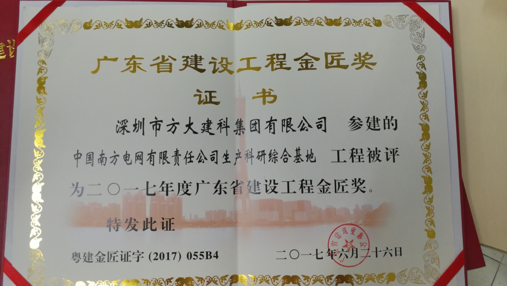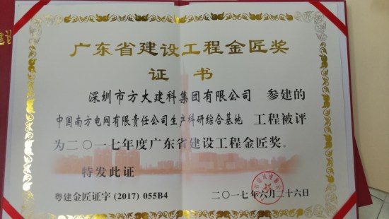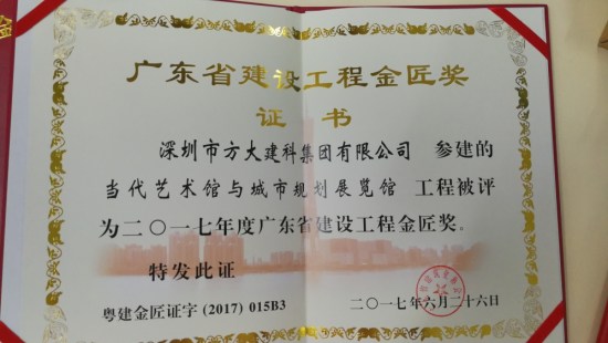 近日,由深圳市方大建科集團有限公司承建幕墻工程的深圳當代藝術館與城市規劃展覽館、深圳中信銀行大廈、廣州南方電網生產科研綜合基地,同時榮獲廣東省建筑行業工程質量的最高榮譽獎——金匠獎