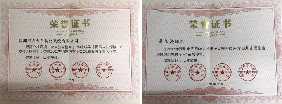11月14日,深圳市第三十屆優秀質量管理小組活動表彰大會在深圳市建科院舉行,方大集團股份有限公司全資子公司深圳市方大自動化系統有限公司提高立柱焊接一次交驗合格率QC小組榮獲2017年深圳市優秀QCC成果選拔賽優秀獎,自動化公司質量安全部黃良江榮獲深圳市質量信得過班組先進個人榮譽稱號。