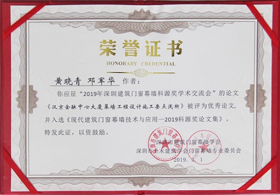 本次學術交流會上,方大建科發表了文林編寫的《豎向大線條插接型單元幕墻設計淺析》、黃曉青、鄧軍華編寫的《漢京金融中心大廈幕墻工程設計施工要點淺析》、楊全新編寫的《新型工業化幕墻的發展思路》共三篇論文并入選《現代建筑門窗幕墻技術與應用》論文集,其中《豎向大線條插接型單元幕墻設計淺析》與《漢京金融中心大廈幕墻工程設計施工要點淺析》被評為優秀論文。