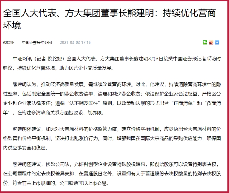 全國人大代表、方大集團(tuán)董事長(zhǎng)熊建明3月3日接受中國證券報(bào)記者采訪時(shí)建議,持續(xù)優(yōu)化營商環(huán)境,助力民營企業(yè)高質(zhì)量發(fā)展。